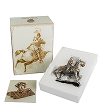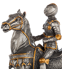 Статуэтка «Средневековый воин на коне», сделанная из олова, изображает всадника верхом на красивой, грациозной лошади. Седло наездника находится под небольшой попоной, края которой украшены золотой краской, а на груди коня красуется ремень с золотыми украшениями в форме полумесяца. Рыцарь, находящийся в седле, носит круглый закрытый металлический шлем, и легкие доспехи, напоминающие современный бронежилет.