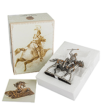 Там же, с правой стороны, можно заметить длинный колчан со стрелами и старинный клинок в изящно украшенных ножнах. Статуэтка имеет темно-серый цвет, а некоторые элементы одежды седока и сбруя коня покрыта позолотой.
