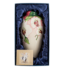 На поверхности изделия запечатлены веточки орхидей, усеянные белоснежными распустившимися бутонами. Удачное сочетание цветовых оттенков, а также искусное исполнение вазы делают это изделие отличным подарком и идеальным интерьерным украшением.