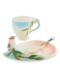 Нежно-голубой великолепно перетекает в спокойный зеленый цвет листьев на фоне безоблачного неба, а скромная, но невероятно красивая птичка привносить в композицию покой, уют, беспечность. Красота, успокаивающая гармония, изысканность линий — такова эта чайная пара, которая может сделать каждое домашнее чаепитие настоящим праздником.