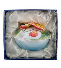 Шкатулка отличается общим нежно-голубым фоном, который дополняет выпуклые зелёные линии стеблей цветка. Она создана из качественного фарфора, очень легкая и удобная в использовании. Прекрасно дополнит коллекцию фарфоровых предметов.