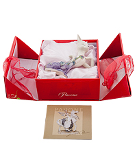 Кошечка, прикрывшая глаза и приложившая левую лапу к груди, покрашена в белый цвет, но низ ее туловища украшен ярким цветком, который изображен на фиолетовом фоне. Кошки в цветочек в жизни встречаются редко, и фарфоровая фигурка могла бы сослужить неплохую службу, украсив собой шеренгу домашних растений.