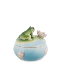 Современная шкатулка «Лягушка на кувшинке» обладает идеальными формами и представлена в нежно-голубом дизайне с усыпанными по периметру розовыми цветами. Общая картина чётко показывает живую природу и её красоту, реалистичность линий дополняется безупречными формами и блеском фарфора.