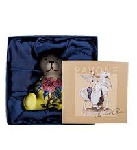 Белое туловище медведя художники не стали покрывать коричневой краской, имитирующей плюш – это было бы слишком банально. Изысканный вкус художника подсказал покрасить низ медведя в желтый цвет, а на желтом фоне нарисовать небольшой куст с двумя крупными розовыми цветками и синими листьями. Медведь, расположившийся в классической сидячей позе, производит впечатление гостя, пришедшего на день рождения с букетом цветов.