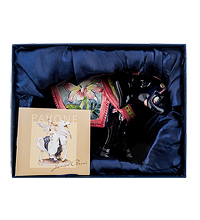 Высота фарфорового слона – 13 сантиметров. Животное изображено во время передвижения: его большие лапы медленно шагают по земле. Слон одет в светлую попону и головной убор, которые напоминают расцветкой женский носовой платок: ткань украшают красно-белые цветы, изображенные на бледно-голубом фоне. У слона большие блестящие уши и закрученный в спираль хобот.