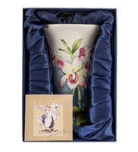 Фарфоровая ваза ''Орхидея'' — настоящее произведение искусства. В её дизайне волшебным образом обыграна цветочная тематика. Яркие тона подобраны идеально — крупные орхидеи нежно-розового цвета с красными кончиками и желтыми серединками, смотрятся эффектно. Верхняя часть вазы белого цвета и плавный переход в голубой оттенок, не нарушает общей палитры цветов.