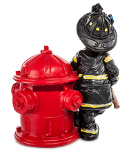 Веселая статуэтка пожарника. Почему этот пожарный так горделиво улыбается, облокотившись на пожарную колонку? Буквально сияет своей белозубой улыбкой, хвастаясь новенькой пожарной формой и ярко-красным топором. Дело в том, что некоторые настольные статуэтки имеют секрет, и эта – в том числе. Присмотритесь – сзади в пожарной колонке сделана прорезь, в которую можно кидать монетки – это копилка!