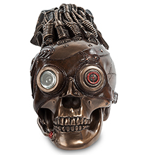 Статуэтка «Череп», выполненная в стиле «стимпанк», понравится тем, кто увлечен техникой и смело смотрит в будущее. В мире машин нет ограничений: в любой предмет можно вдохнуть жизнь, а человеческие останки не символизируют смерть или опасность. Наш череп не вызывает неприятных ассоциаций или страха; он вполне дружелюбен, хотя и напоминает Терминатора без грима. Отсутствие волос и кожного покрова компенсируется проводами и устройствами, заменяющими черепу утерянные органы чувств.