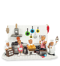 В составе многочисленных фигурок из полистоуна встречаются художественные статуэтки, изображающие поваров, официанток, которые гораздо лучше себя будут чувствовать не на полке, а на специальном стенде, изображающем интерьер кухни. В сочетании с обычным кухонным интерьером, украшенным привычными вязками чеснока или горького перца, весь этот кулинарный цех будет смотреться гораздо интереснее.
