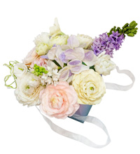 Букет с цветами ручной работы из холодного фарфора. Нежный и воздушный, в букете словно затейливая мелодия перекликаются оттенки сливочных лютиков, нежно розовых роз Остина , словно искорки выглядывают веселые нарциссы и придаёт пикантность композиции белая эустома