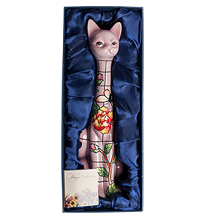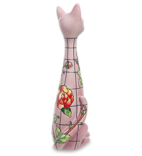 Кошка очень стройна, и в сидячем положении напоминает морской маяк. Керамическое животное окрашено в фиолетовый цвет, и немного напоминает высокий экзотический чайник. Шея и тело кошки покрыто крупной черной сеткой, а также изображением нескольких крупных цветущих растений.