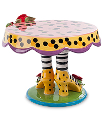 Тортовница оформлена ярко и своеобразно. Верхняя часть (на которой будет располагаться торт) покрашена в розовый цвет, а ножка и подставка оформлены в виде женских ног. Ноги обуты в желтые туфли, каждый из которых украшен красной розой. На ногах – черно-белые полосатые чулки, а все части тортовницы (за исключением чулков) окрашены в крупный черный горошек.