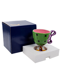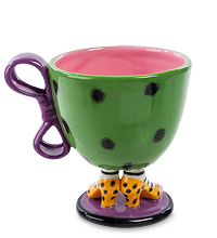 Такого вы еще не видели никогда. Чашка на ножках! Причем на вполне человеческих ножках, в полосатых черно-белых носочках и ярко-желтых в черный горошек туфельках. А сама чашка имеет вполне обычный вид, только ручка выполнена в виде бантика, прикрепленного к чашке. Своеобразное произведение искусства для любителей Босха и Сальвадора Дали. Такому предмету вполне нашлось бы место на их полотнах. Ценителю искусства сюрреализма он также придется по вкусу. А может быть, окажется первым знакомством с этим необычным живописным течением и далее обладатель такой чашки станет настоящим специалистом в картинах этого направления.