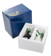 Эта пара зеленых пучеглазых лягушек предстает перед нами в образе молодоженов, танцующих свой свадебный вальс. На ней – белое свадебное платье и венок из цветов на голове, он – в строгом черном костюме. Прекрасная парочка даже на обеденном столе будет выглядеть оригинально и привлекательно. Но любой из сидящих за столом будет стараться их на время между собой разлучить. Оба молодожена выполняют особую функцию – солонки и перечницы. Почетная задача, вот только бы не разбирали поодиночке. А ведь придется: мало кому надо и солить и перчить блюдо одновременно. Но ничего, встреча неизбежна и разлука долго не продлится.