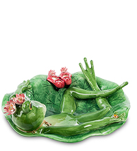 Это не простое блюдо, на котором можно подать фрукты или сладости к чаю. Оно представляет собой большой зеленый лист, на котором устроилась на отдых огромная лягушка. Сложила по-турецки ноги, сняв и поставив радом ярко-красные туфельки. Раскинула на половину блюда передние лапы – на правой красуется перстень с желтым камнем. Голова украшена розовыми цветами, на груди на золотой цепочке – кулон в виде стрекозы. Похоже, не из простых лягушка, может, даже легендарная царевна. Но вот ее завалят фруктами, и только голова будет высовываться из-под них, удивленно глядя и не понимая, почему же ей мешают отдыхать. Так что угощайтесь, съедайте все и дайте лягушке покой.
