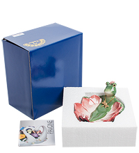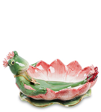 Это – самая настоящая царевна-лягушка. Во-первых, на голове у нее корона, пусть и не золотая, а из красивого цветка с розовыми лепестками – но все равно символ благородного происхождения. Лягушка принимает ванну, расслабившись в чаше из розового цветка. На ее груди – золотая цепь с кулоном в виде стрекозы и чувствует себя царевна явно превосходно. Но это – не безделушка, а конфетница, которую можно подать на стол к чаепитию. И пусть тогда голову лягушки не будет видно из-за горы сладостей, ее выпученные глаза будут внимательно следить за всеми гостями – не окажется ли среди них сказочного царевича по имени Иван?