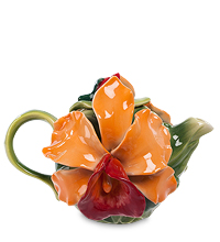 Компактный чайник, выполненный из фарфора, украшен фигуркой, которая в точности повторяет красоту и совершенство бутона орхидеи. Основа чайника расписана темно-зелеными красками, а цветочный декор оформлен в оранжево-красных тонах, благодаря чему изделие отличается удивительной яркостью и выразительностью.