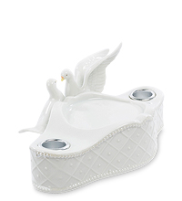 Очень символический подсвечник. В нем можно установить три свечи – две тоненьких и одну толстую. Похоже, это можно расшифровать как две души, которые, слившись воедино, дают начало новому и очень сильному чувству – любви. Оформление подсвечника тоже говорит о любви: на двух цветках розы уселась влюбленная пара голубей. Голубь воркует, распустив свои крылья, объясняется со своей голубкой, а та буквально глаз с него не сводит. Подарок такой – это или знак любви, обещание романтических отношений, или их пожелание, если его дарят друзья влюбленной паре или молодоженам.