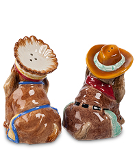 Эта пара собачек выступает в интересных ролях. Одна из них – шериф, типичный герой Дикого Запада, с красным в горошек пером на шее и ковбойской шляпе на голове. Второй фарфоровый песик – индейский вождь с целой короной роскошных перьев в головном уборе и традиционными бусами на груди. Обе собачки мирно настроены друг к другу, ведь им проходится делать одно общее дело – обеспечивать обеденный стол солью и перцем. Такую солонку или перечницу просто приятно взять в руки, внимательно рассмотреть и только после этого использовать по назначению, подкорректировав вкус того или иного блюда.