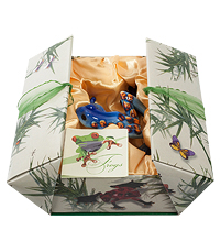 Водится она на юге Китая. Свое название она получила за специфический звук, который способна издавать. Лягушка имеет очень необычную раскраску. На белоснежной коже видны синие и красные орнаменты. Поставив сувенир такой лягушки в доме, вы наполните его позитивными эмоциями и дружелюбием.