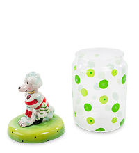Отличным примером кухонной утвари с душой можно смело назвать банку для сыпучих "Пудель", которая станет отменным вместительным помощником и броским красивым предметом декора одновременно. Цветовая гамма милой баночки – «цирковая», прозрачное стекло основы украшают яркие зелено-салатовые круги, на крышке в мелкую черную крапинку сидит красно-белый пудель.