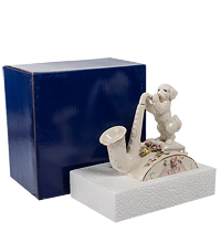 Маленький беленький щенок увлеченно дует в мундштук саксофона. И не так уж важно, умеет ли он на самом деле играть – вся эта композиция служит украшением музыкальной шкатулки, которая сама по себе может воспроизводить музыку. Слушайте любимую мелодию и представляйте себе, что щенок на саксофоне – один из участников оркестра. Основание фигурки, скрывающее музыкальную начинку, отделано по краям золотым кантом и усыпано нежными цветами. Они – тоже фарфоровые, но так похожи на живые! Музыкальная композиция станет отличным украшением спальни, особенно оформленной в нежном классическом стиле.