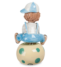 Клоун уселся верхом на огромный мяч и готовится повеселить зрителей. Из всей клоунской раскраски на его лице только характерная красная нашлепка на кончике носа. Шапочку с козырьком он развернул вбок – так забавнее. Но он не просто сидит на мяче и даже не прыгает через него. Эта фигурка – не простая, а музыкальная, и если завести ключиком пружинный механизм, будут звучать звуки музыки, а клоун на мяче начнет вращаться. Совершенно неожиданное действие, зато смотрится действительно смешно. И пусть этот клоун только учится выступать на цирковой арене, он еще мальчишка, который только мечтает о цирке, но номер у него явно получился.