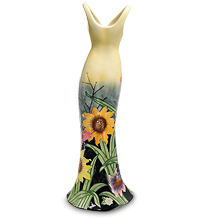 Напольная ваза «Платье» настолько изыскана, что никто с этим не будет спорить. Она словно шедевр искусства. Мастера проработали каждую ее деталь. Декольте, подол платья, плавные линии талии смотрятся просто роскошно. А чего только стоит цветовая гамма. Ее нежный, теплый верх превосходно дополняется удивительной картиной цветов. Цветы настолько яркие, что невозможно их не заметить. Они дополняют и делают просто идеальной и совершенной вазу-платье.