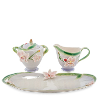 Сахарница усыпана нежно-розовыми Орхидеями, а цветовая гамма бело-голубых оттенков приятно радует глаз. Молочник мило украшен божьей коровкой. Нежный дизайн делает чайный набор неповторимым и желанным для коллекционеров. В комплекте небольшое блюдце для фруктов и сладостей к чаю.