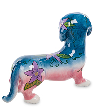 Необычность фигурки в выбранной художником цветовой гамме и рисунке, нанесенном на белое тело жизнерадостной собаки. На лбу у таксы пылает алое сердечно, длинные уши украшены желто-фиолетовыми цветами. Те же цветы, но большего размера, игриво разбросаны по телу собаки.