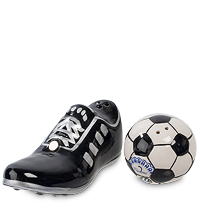 Если в семье есть футболист – взрослый профессионал, маленький начинающий спортсмен или заядлый болельщик, в доме все должно напоминать о футболе. Вот и на обеденном столе среди посуды вполне может оказаться спортивная обувь и мяч. Удивленным гостям можно предложить потрогать: это не обычная бутса и не настоящий мяч – это солонка и перечница, которые своей формой напоминают об увлечении хозяина дома. Посолив и поперчив еду, гости невольно заговорят о футболе, а что еще надо хозяину, кроме беседы на любимую тематику? Он ведь больше ни о чем другом и говорить не любит. Так что вдвойне полезными окажутся эти фигурки!